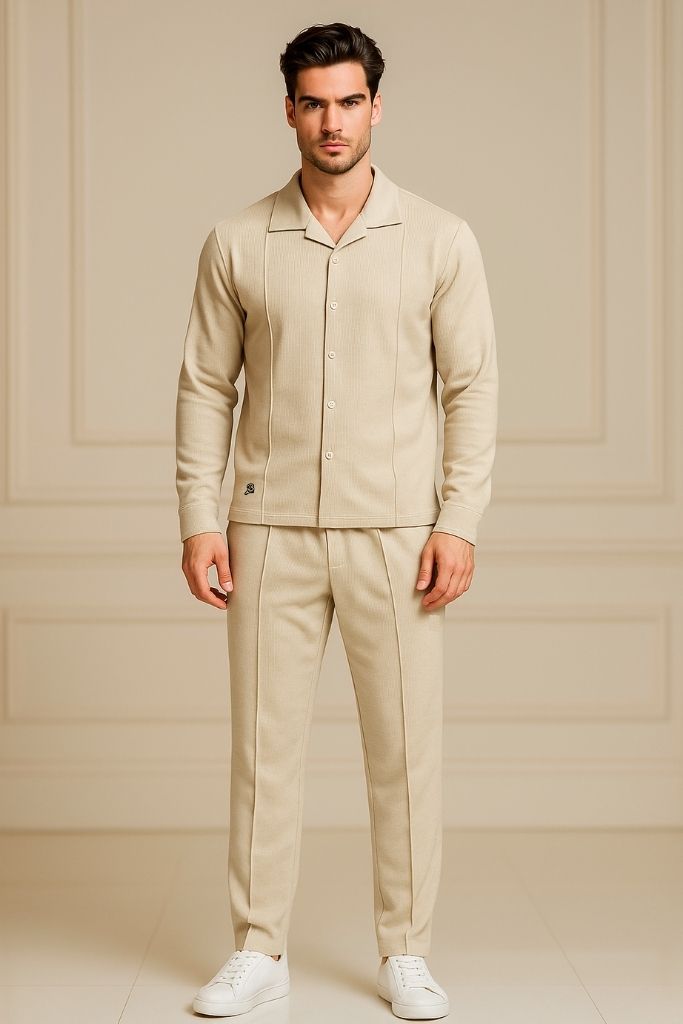 Waffle Beige F-Sleeve Safari Suit for Men – Premium Comfort Series